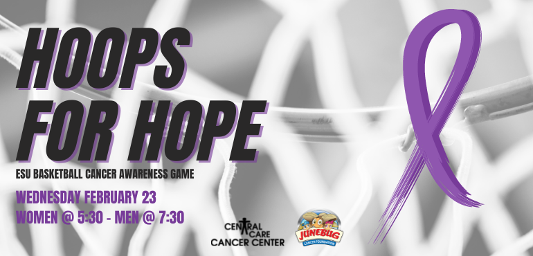Join us and our friends at Emporia State University on Wednesday, February 23rd at 5:30 PM for an evening of basketball and fundraising! The women's basketball team plays at 5:30 PM and the men's basketball team plays at 7:30 PM at the William L. White Auditorium. T-shirts will be available for the first 200 fans who donate $5 and there will also be raffle prizes! All donations will benefit local cancer patients through the June Bug Cancer Foundation. We hope to see you there!